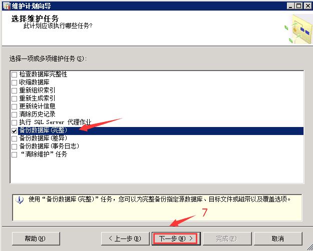 七、此處選擇【備份數(shù)據(jù)庫(完整)】,然后【下一步】: