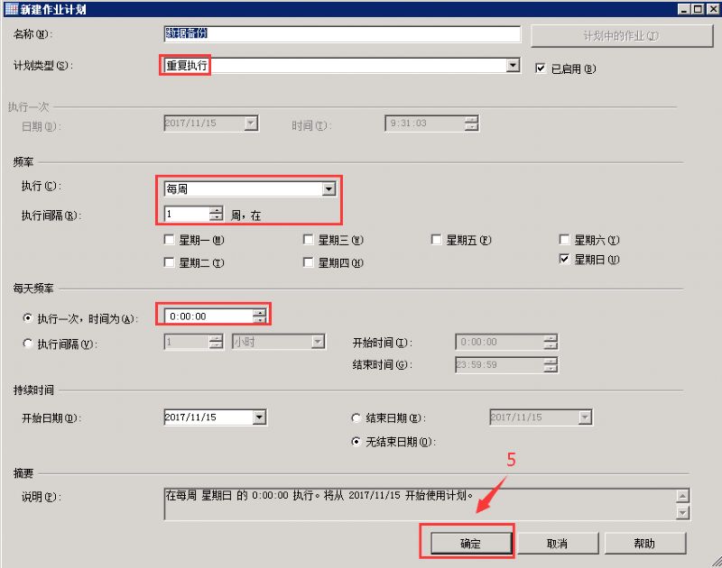 五、在【新建作業(yè)計(jì)劃】界面,選擇數(shù)據(jù)庫備份的頻率,如圖,然后確定: