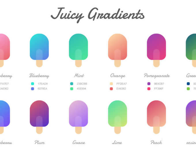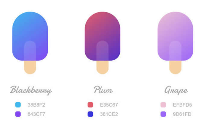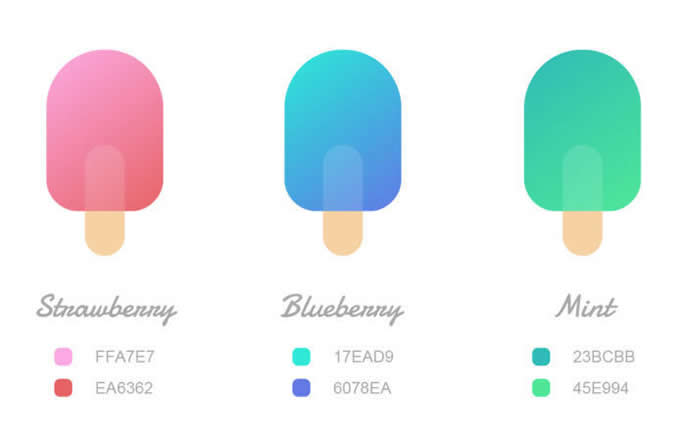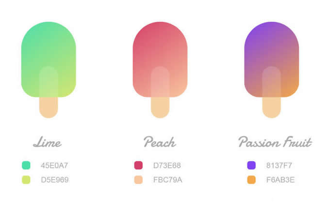 這是一組來(lái)自 Dribbble 設(shè)計(jì)師 David J 的配色作品,作者畫(huà)了12塊冰棒,并加上非常驚艷的夏天漸變配色,看上去非??煽?。如果用到夏天的促銷(xiāo)專(zhuān)題面上一定很適合。