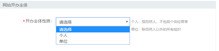 網(wǎng)站開辦者根據(jù)自身情況選擇個人或單位,企業(yè)、事業(yè)單位、政府機關、社會團體、個體經(jīng)營戶等非自然人通通選單位。