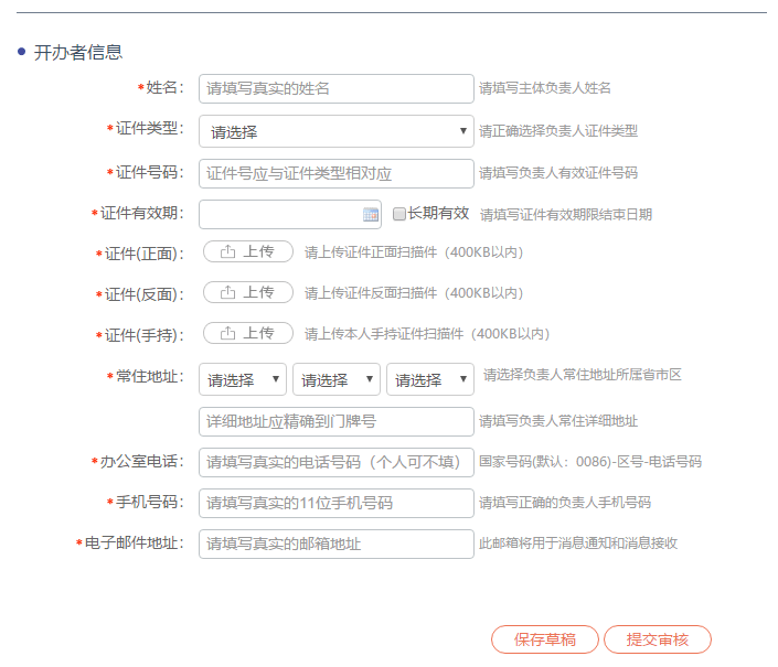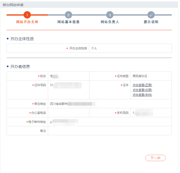 直接填寫開辦者信息,個人備案不需要填寫辦公室電話,然后點擊“提交審核”。