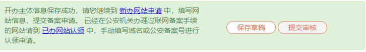 提交成功后,系統(tǒng)會提示繼續(xù)填寫網(wǎng)站信息,點擊“新辦網(wǎng)站申請”。如果您之前辦理過,請點擊“已辦網(wǎng)站認領”。