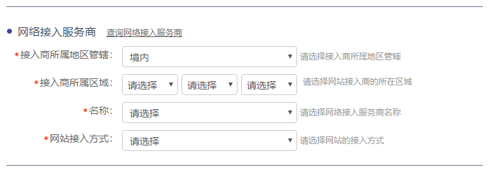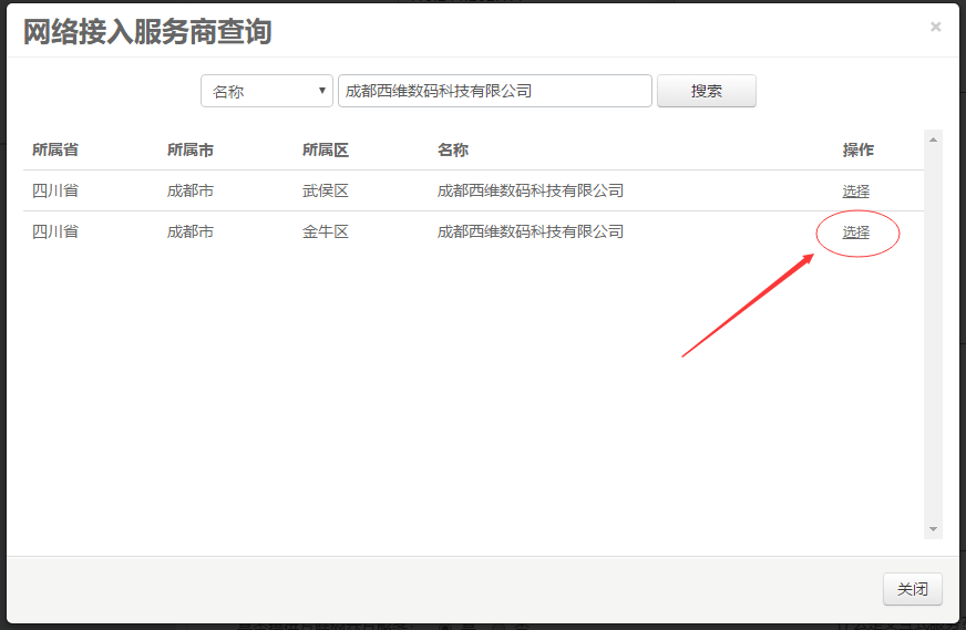 填寫網(wǎng)絡接入服務商,點擊“查詢網(wǎng)絡接入商”,輸入“成都西維數(shù)碼科技有限公司”,選擇金牛區(qū)。如下圖:
