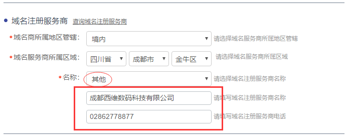 我司注冊的域名,名稱選擇“其他”,注冊商服務商填寫“成都西維數(shù)碼科技有限公司”,電話填寫“02862778877”。
