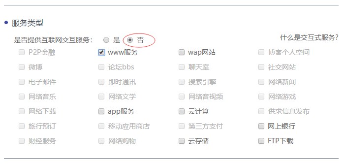 服務類型,如需要選擇“www服務”,請將是否提供互聯(lián)網(wǎng)交互服務改為否。