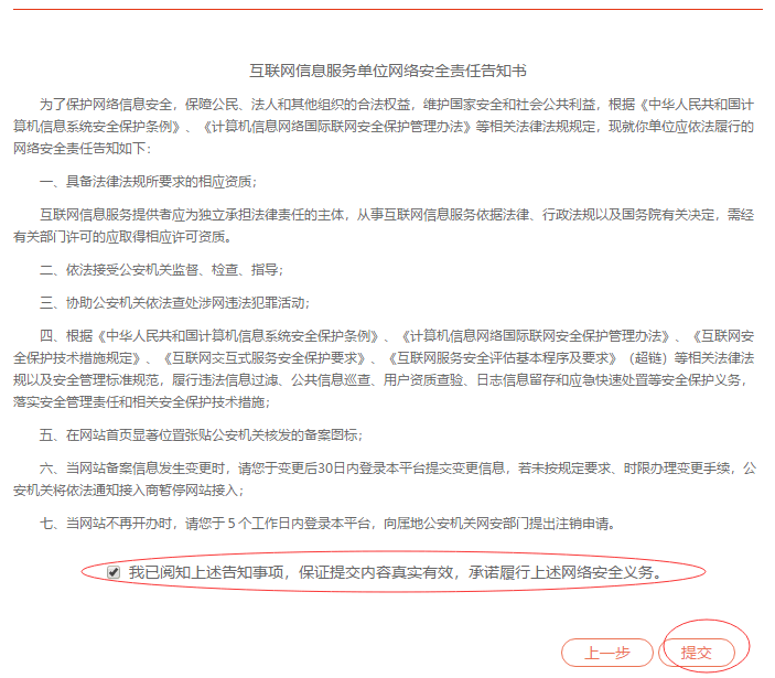 最后請仔細閱讀《互聯(lián)網(wǎng)信息服務單位網(wǎng)絡安全責任告知書》,并勾選和提交。