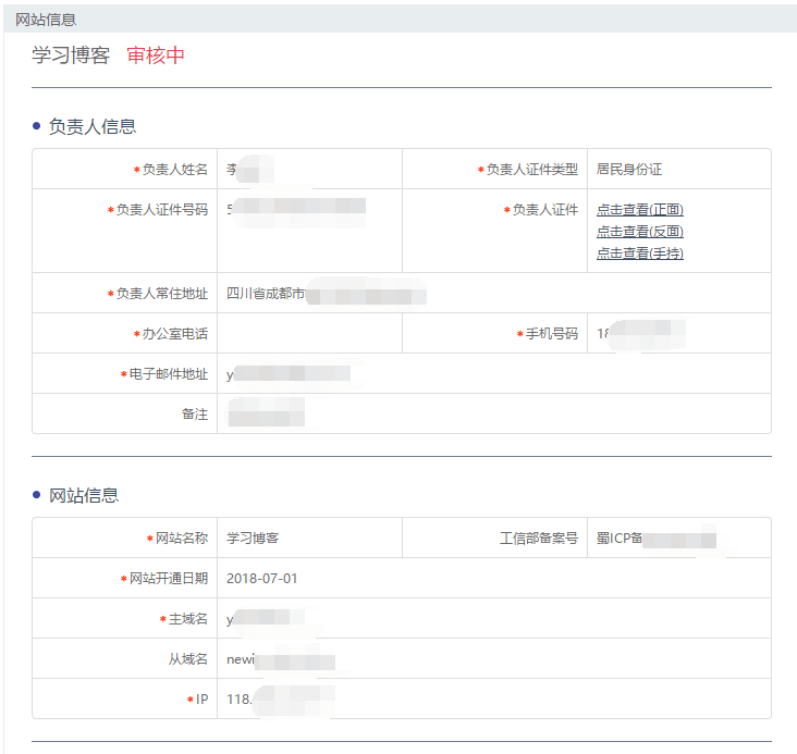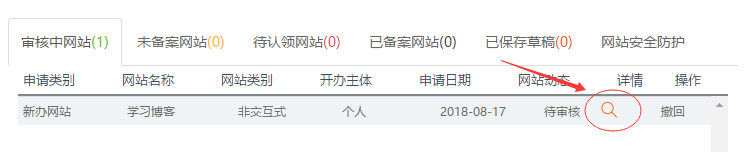 提交完成后,可以點擊此圖標查看網(wǎng)站備案詳情。