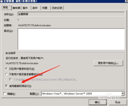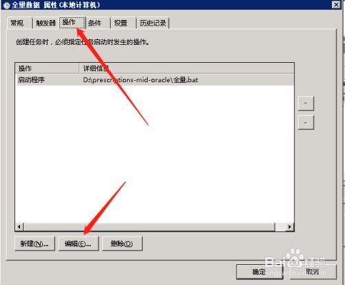 4、進入到編輯操作界面,“程序或腳本”填入要執(zhí)行的腳本的路徑,“起始于”處填入腳本所在的目錄,點擊“確定”