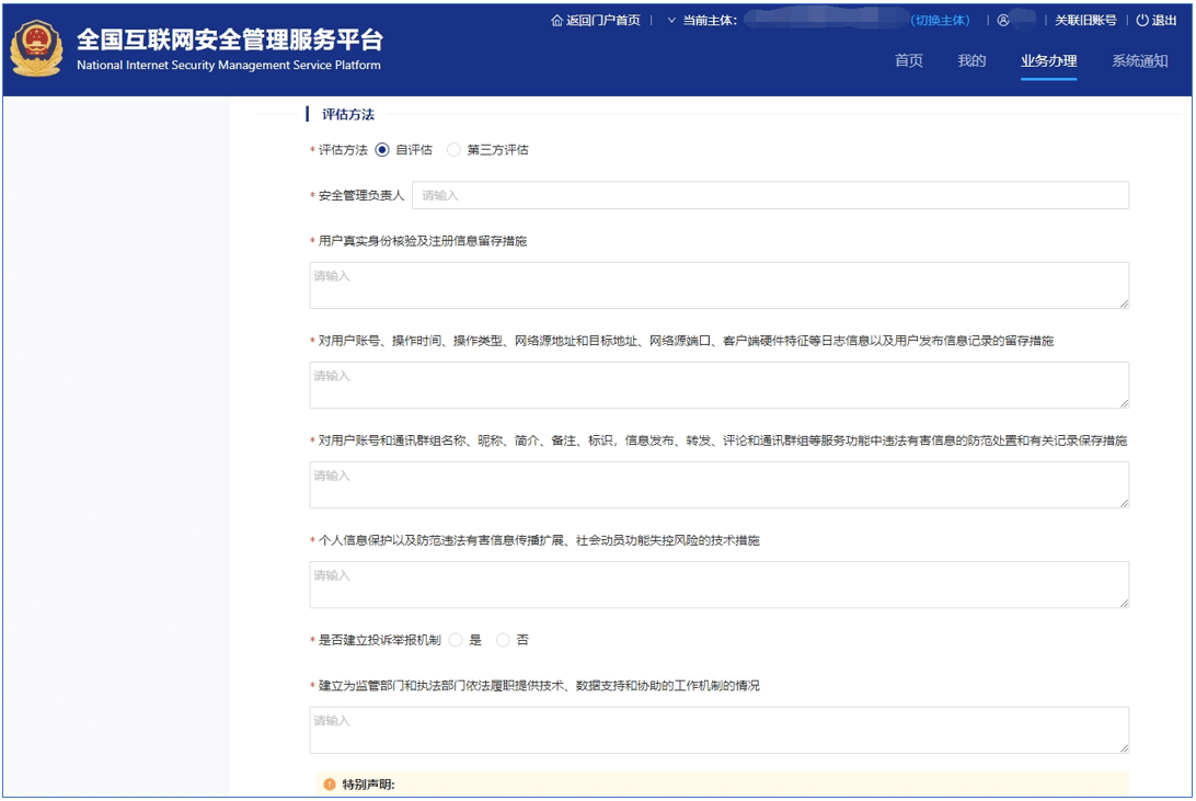 然后需要填寫“主要內(nèi)容”,這部分相對(duì)復(fù)雜,一共需要填寫 7 大內(nèi)容,主要都是一些安全管理、隱私防護(hù)等方面的內(nèi)容,每條限制 450 字,而且需要用書面、規(guī)范語言回答。
